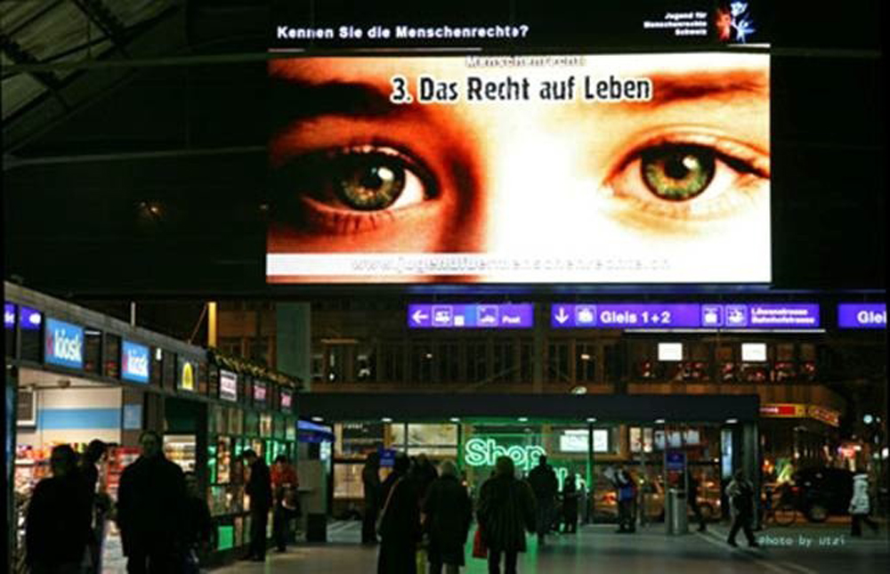 Toutes les quatre minutes, un des trente droits de la Déclaration universelle des droits de l’Homme est diffusé dans les grandes gares de Suisse, marquant ainsi le 60e anniversaire de la Déclaration. Ces spots, diffusés sur écran géant dans les grandes gares de Zurich, Berne, Lausanne et Genève, ont diffusé le message des droits de l’Homme 1500 fois par jour.