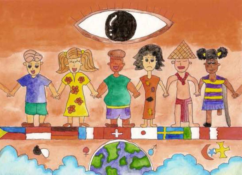 L’illustrazione vincente raffigura il fatto che i diritti umani uniscono popoli di tutte le culture.