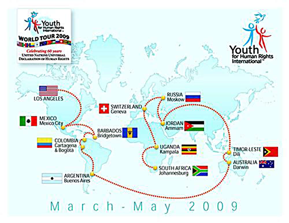 YHRI的世界巡迴之旅在2004、2005、2006、2007與2008年拜訪了將近70國,將我們的人權教育計畫案呈現給國家元首、領袖與教育者,以及在大學、學校、醫院、少年拘留所與孤兒院的青少年。